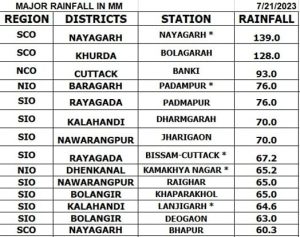 ଚଳିତ ମୌସୁମୀ ଋତୁରେ, ୧ ଜୁନରୁ ଆଜି ୨୧ ଜୁଲାଇ ମଧ୍ୟରେ ୩୭୨.୧ ମିମି ବର୍ଷା ରେକର୍ଡ କରାଯାଇଛି। ଯାହା ସ୍ୱାଭାବିକ ବର୍ଷା ୪୩୪.୧ ମିମି ତୁଳନାରେ ୧୪ ପ୍ରତିଶତ କମ ରହିଛି। ୬୪୨.୪ ମିମି ସହ ମାଲକାନଗିରିରେ ସର୍ବାଧିକ ୪୧% ଅଧିକ ଏବଂ ମୟୁରଭଞ୍ଜ ଜିଲ୍ଲାରେ ୨୬୦.୬ ମିମି ସହ ସର୍ବନିମ୍ନ ୪୫% କମ ବର୍ଷା ରେକର୍ଡ ହୋଇଛି। ସେହିପରି ମୌସୁମୀ ସ୍ୱାଭାବିକ ସହ ଗତ ୨୪ ଘଣ୍ଟାରେ ରାଜ୍ୟରେ ହାରାହାରି ୧୬.୫ ମିମି ବର୍ଷା ରେକର୍ଡ ହୋଇଛି ଯାହା ସ୍ୱାଭାବିକ ବର୍ଷା ୧୬.୬ ମିମି ତୁଳନାରେ ୧ ପ୍ରତିଶତ କମ ରହିଛି।