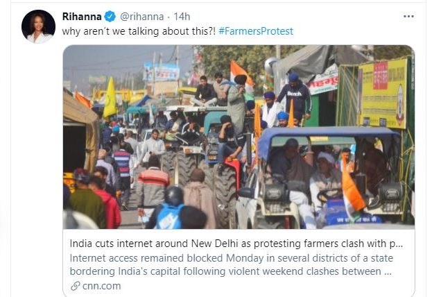 ନୂଆଦିଲ୍ଲୀ: ଚାଷୀ ଆନ୍ଦୋଳନ ତେଜିବାରେ ଲାଗିଛି । ଜିଦରେ ଅଟଳ କୃଷକ ସଂଗଠନ । ଦେଶ ବାହାରେ ବି ଚାଷୀ ଆନ୍ଦୋଳନକୁ ନେଇ ଆରମ୍ଭ ହୋଇଛି ଆଲୋଚନା । ଚାଷୀଙ୍କ ସମର୍ଥନରେ ବାହାରିଛନ୍ତି ଗ୍ଲୋବାଲ୍ ସେଲିବ୍ରିଟି । ହଲିଉଡ୍ ପପ୍ ଷ୍ଟାର ରିହାନା ଏନେଇ ଚିନ୍ତା ପ୍ରକଟ କରିବା ସହ ଏକ ଟ୍ୱିଟ୍ କରିଛନ୍ତି । ସେ ଲେଖିଛନ୍ତି, ଦୁଇ ମାସରୁ ଊର୍ଦ୍ଧ୍ୱ ସମୟ ଧରି ରାଜରାସ୍ତାରେ ବସିଥିବା ଚାଷୀଙ୍କ ସମ୍ପର୍କରେ କାହିଁକି ଆଲୋଚନା କରାଯାଉନି ?