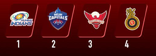 ଦୁବାଇ: ଇଣ୍ଡିଆନ ପ୍ରିମିୟର ଲିଗ୍ ଅନ୍ତିମ ପର୍ଯ୍ୟାୟରେ ପହଂଚିଯାଇଛି । ସମସ୍ତ ଲିଗ୍ ମ୍ୟାଚ ଖେଳାଯିବା ପରେ ମୁମ୍ବାଇ ଇଣ୍ଡିଆନ୍ସ, ଦିଲ୍ଲୀ କ୍ୟାପିଟାଲ୍ସ, ସନରାଇଜର୍ସ ହାଇଦ୍ରାବାଦ ଓ ରୟାଲ ଚ୍ୟାଲେଞ୍ଜର୍ସ ବାଙ୍ଗାଲୋର ପ୍ଲେ ଅଫରେ ପ୍ରବେଶ କରିଛି । ଦିଲ୍ଲୀ ଓ ବାଙ୍ଗାଲୋର ପ୍ରଥମ ଏବଂ ମୁମ୍ବାଇ ଇଣ୍ଡିଆନ୍ସ ୫ମ ଟାଇଟଲ ଲକ୍ଷ୍ୟରେ ରହିବେ ।