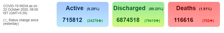 ଦିନକରେ ସାରା ଦେଶରେ କରୋନାରେ ଆଖି ବୁଜିଛନ୍ତି ଆଉ ୭୦୨ ଆକ୍ରାନ୍ତ । ମହାମାରୀରେ ମଲେଣି ମୋଟ୍ ୧ ଲକ୍ଷ ୧୬ ହଜାର ୬୧୬ ଜଣ । ମୃତ୍ୟୁହାର ରହିଛି ୧.୫୧% ।