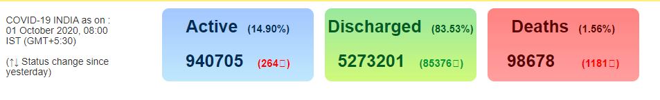 ଦେଶରେ ସୁସ୍ଥଙ୍କ ସଂଖ୍ୟା ୫୨ ଲକ୍ଷ ୭୩ ହଜାର ୨୦୨କୁ ବୃଦ୍ଧି ପାଇଛି । ଆକ୍ଟିଭ୍ କେସ୍ ରହିଛି ୯ଲକ୍ଷ ୪୦ ହଜାର ୭୦୫ । ମହାରାଷ୍ଟ୍ର, ଆନ୍ଧ୍ରପ୍ରଦେଶ ଓ କର୍ଣ୍ଣାଟକରେ କରୋନା ସ୍ଥିତି ସଙ୍ଗୀନ ରହିଛି । ଗତ ୨୪ ଘଣ୍ଟାରେ ମହାରାଷ୍ଟ୍ରରୁ ସର୍ବାଧିକ ୧୮ ହଜାର ୩୧୭ ନୂଆ ଆକ୍ରାନ୍ତ ଚିହ୍ନଟ ହୋଇଥିବା ବେଳେ କର୍ଣ୍ଣାଟକରୁ ୮ ହଜାର ୮୫୬, କେରଳରୁ ୮ ହଜାର ୮୩୦, ଆନ୍ଧ୍ରପ୍ରଦେଶରୁ ୬ ହଜାର ୧୩୩ ପଜିଟିଭ୍ କେସ୍ ବାହାରିଛି ।