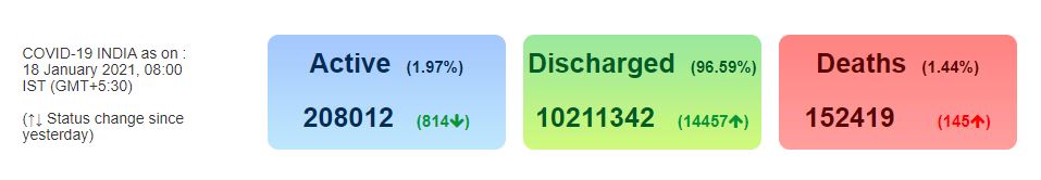 ଦେଶରେ ହ୍ରାସ ପାଇଛି ଦୈନିକ କରୋନା ମୃତ୍ୟୁସଂଖ୍ୟା । ଗତ ୨୪ ଘଣ୍ଟାରେ ସାରା ଦେଶରୁ ଆଉ ୧୪୫ ସଂକ୍ରମିତ ଚିକିତ୍ସାଧୀନ ଅବସ୍ଥାରେ ପ୍ରାଣ ହରାଇଛନ୍ତି । ମୋଟ୍ ମୃତ୍ୟୁସଂଖ୍ୟା ୧ଲକ୍ଷ ୫୨ହଜାର ୪୧୯ ଛୁଇଁଛି । ଦେଶରେ ମୃତ୍ୟୁହାର ରହିଛି ୧.୪୪%।