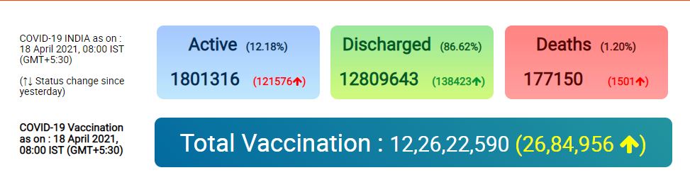 ସଂକ୍ରମଣ ସହ ବଢୁଛି ଆକ୍ଟିଭ୍ କେସ୍ । ବର୍ତ୍ତମାନ ସୁଦ୍ଧା ଦେଶରେ ୧୮ଲକ୍ଷ ୧ହଜାର ୩୧୬ଟି କରୋନା ସକ୍ରିୟ ମାମଲା ରହିଛି । ବିଭିନ୍ନ ରାଜ୍ୟରେ ହସ୍ପିଟାଲରେ ସ୍ଥିତି ଉଦବେଗଜନକ ହେଲାଣି । ଗତ ୨୪ ଘଣ୍ଟାରେ ଆଉ ୧ଲକ୍ଷ ୩୮ହଜାର ୪୨୩ ସଂକ୍ରମିତ ସୁସ୍ଥ ହୋଇଛନ୍ତି । ଏହାକୁ ମିଶାଇ ସୁସ୍ଥ ସଂଖ୍ୟା ୧କୋଟି ୨୮ଲକ୍ଷ ୯ହଜାର ୬୪୩ରେ ପହଞ୍ଚିଛି ।