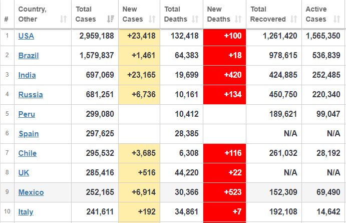 ଜନ୍ ହପକିଙ୍ଗ ବିଶ୍ୱବିଦ୍ୟାଳୟ ତଥ୍ୟ ଅନୁସାରେ ବର୍ତ୍ତମାନ ଋଷିଆରେ କରୋନା ସଂକ୍ରମିତଙ୍କ ସଂଖ୍ୟା ରହିଛି ୬ ଲକ୍ଷ ୮୧ ହଜାର ୨୫୧ । ଏବେ ଭାରତ ତୃତୀୟ ସ୍ଥାନରୁ ଉଠିଥିବା ବେଳେ ଚତୁର୍ଥକୁ ଖସିଛି ଋଷିଆ । ଟପ୍ ପୋଜିସନରେ ଆମେରିକା ରହିଥିବା ବେଳେ ଦ୍ୱିତୀୟ ପ୍ରଭାବିତ ଦେଶ ବ୍ରାଜିଲ୍ ।