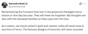 ନୂଆଦିଲ୍ଲୀ: ପହଲଗାମ ଆକ୍ରମଣକୁ ଆଜି ବର୍ଷେ ପୁରିଛି । ପ୍ରଥମ ବାର୍ଷିକୀରେ ପ୍ରଧାନମନ୍ତ୍ରୀ ନରେନ୍ଦ୍ର ମୋଦି ଏକ ଦୃଢ଼ ବାର୍ତ୍ତା ଦେଇଛନ୍ତି । ସେ କହିଛନ୍ତି ଯେ, ନିର୍ଦ୍ଦୋଷ ଲୋକଙ୍କ ମୃତ୍ୟୁକୁ ଭୁଲି ହେବ ନାହିଁ । ପହଲଗାମ ଆକ୍ରମଣରେ ନିର୍ଦ୍ଦୋଷ ଲୋକଙ୍କୁ ହତ୍ୟା କରାଯାଇଥିଲା । ଆକ୍ରମଣରେ ପ୍ରାଣ ହରାଇଥିବା ଲୋକଙ୍କୁ ଭୁଲିହେବ ନାହିଁ । ଆତଙ୍କବାଦୀଙ୍କ ଘୃଣ୍ୟ ଯୋଜନା କେବେ ସଫଳ ହେବ ନାହିଁ । ଭାରତ କୌଣସି ପ୍ରକାରର ଆତଙ୍କବାଦ ଆଗରେ ମୁଣ୍ଡ ନୁଆଁଇବ ନାହିଁ । ଏହି ଦୁଃଖ ଏବଂ ସଂକଳ୍ପର ମୁହୂର୍ତ୍ତରେ, ଆମେ ଏକ ରାଷ୍ଟ୍ର ଭାବରେ ଏକତ୍ରିତ ହୋଇ ଠିଆ ହୋଇଛୁ ।
