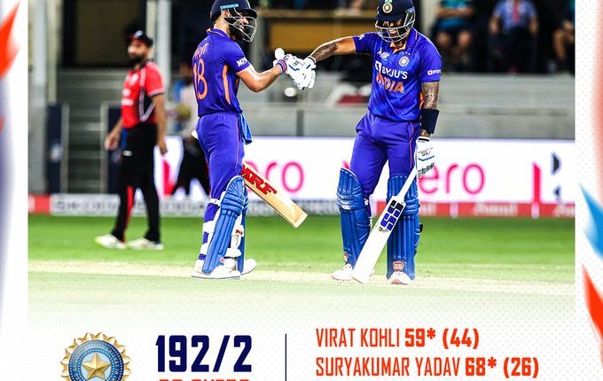 ପ୍ରଥମେ ବ୍ୟାଟିଂ କରିଥିବା ଭାରତ ନିର୍ଦ୍ଧାରିତ ୨୦ ଓଭରରେ ୩ ଓ୍ବିକେଟ ହରାଇ ୧୯୨ ରନ କରିଥିଲା । ଭାରତ ପକ୍ଷରୁ ସୂର୍ଯ୍ୟକୁମାର ୨୬ ବଲରେ ୬୮ ରନ କରିଥିଲେ । ବିରାଟ କୋହଲି ୪୪ଟି ବଲରେ ୫୯ ରନ କରିଥିଲେ । କେଏଲ ରାହୁଲ ୩୬ ଓ ଅଧିନାୟକ ରୋହିତ ଶର୍ମା ୨୧ ରନ କରିଥିଲେ ।