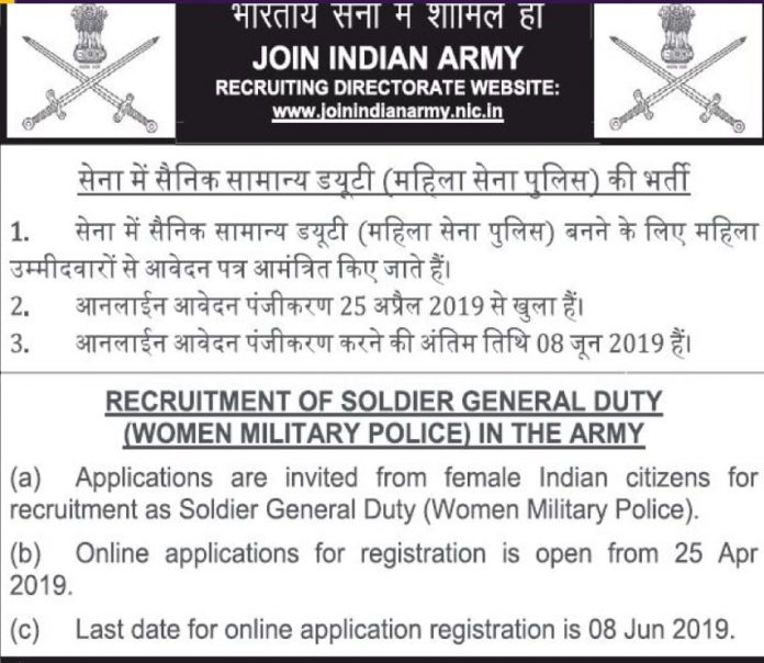 ନୂଆଦିଲ୍ଲୀ: ଭାରତୀୟ ସେନାରେ ମହିଳାମାନଙ୍କ ଲାଗି ଜେନେରାଲ୍ ଡ୍ୟୁଟି ବିଭାଗରେ ନିଯୁକ୍ତି ଲାଗି ଏକ ବିଜ୍ଞପ୍ତି ଗୁରୁବାର ଦିନ ପ୍ରକାଶିତ ହୋଇଛି ।