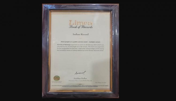 ଗତ ୨୬ ଫେବୃଆରୀ ୨୦୨୪ରେ ରେଳ ମନ୍ତ୍ରଣାଳୟ ଏକ କାର୍ଯ୍ୟକ୍ରମ ଆୟୋଜନ କରିଥିଲା । ଯେଉଁଥିରେ ୨,୧୪୦ ଟି ସ୍ଥାନରେ ୪୦,୧୯,୫୧୬ ଜଣ ଲୋକ ଯୋଗ ଦେଇଥିଲେ । ପ୍ରଧାନମନ୍ତ୍ରୀ ଶ୍ରୀ ନରେନ୍ଦ୍ର ମୋଦୀଙ୍କ ଦ୍ଵାରା ସଡ଼କ ଉପରେ ରେଳ ଓଭରବ୍ରିଜ୍ ଓ ସଡ଼କ ତଳେ ରେଳବାଇ ଅଣ୍ଡର୍ବ୍ରିଜ୍ ଉଦଘାଟନ ଏବଂ ରେଳ ଷ୍ଟେସନର ଶିଳାନ୍ୟାସ ପାଇଁ ଏହି କାର୍ଯ୍ୟକ୍ରମ ଆୟୋଜନ କରାଯାଇଥିଲା। ଭାରତୀୟ ରେଳବାଇର ଏହି ବ୍ୟାପକ ପ୍ରୟାସ ଓ ଏକତ୍ରିକରଣକୁ ମାନ୍ୟତା ମିଳିଛି ଏବଂ ଏହାକୁ ସମ୍ମାନଜନକ ଲିମକା ବୁକ୍ ଅଫ୍ ବିଶ୍ୱ ରେକର୍ଡସ୍ ରେ ସାମିଲ କରାଯାଇଛି ।