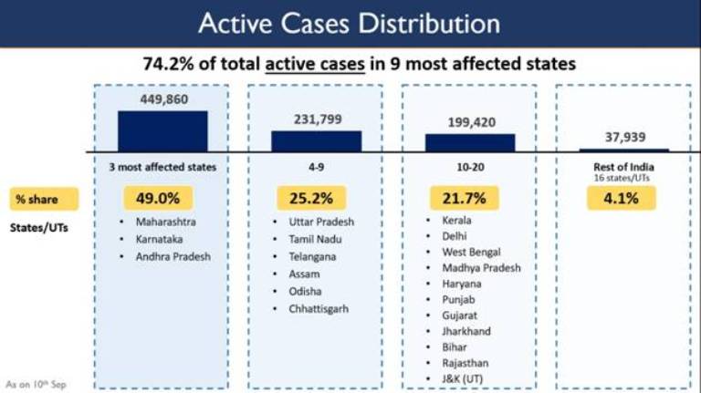 ଦେଶରେ ଆକ୍ଟିଭ୍ କେସ୍ ରହିଛି ୯ ଲକ୍ଷ ୧୯ ହଜାର ୧୮ । କିନ୍ତୁ ୯ଟି ରାଜ୍ୟରେ ମୋଟ୍ ଆକ୍ଟିଭ୍ କେସର କେବଳ ୭୪% କରୋନା ସକ୍ରିୟ ମାମଲା ରହିଛି । ମହାରାଷ୍ଟ୍ର, କର୍ଣ୍ଣାଟକ ଓ ଆନ୍ଧ୍ରପ୍ରଦେଶରେ ରହିଛି କେବଳ ୪୯ ପ୍ରତିଶତ ଆକ୍ଟିଭ୍ କେସ । ଆକ୍ଟିଭ୍ କେସ ତାଲିକାରେ ଓଡ଼ିଶା ସାତ ନମ୍ୱର ସ୍ଥାନରେ ରହିଛି ।