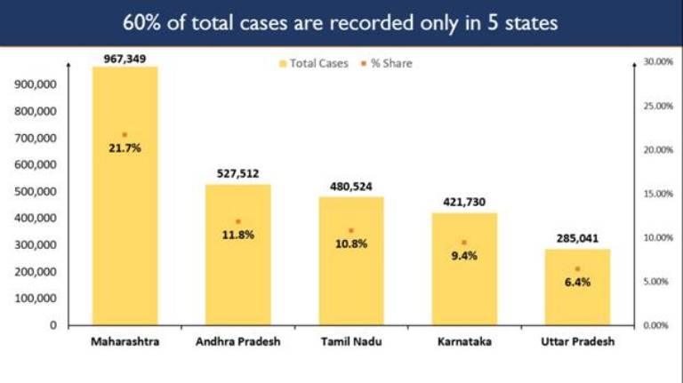 ଗତ ୨୪ ଘଣ୍ଟାରେ ଦେଶରୁ ୯୫ ହଜାର ୭୩୫ ନୂଆ ଆକ୍ରାନ୍ତ ଚିହ୍ନଟ ହୋଇଛନ୍ତି । ଏଥିରୁ କେବଳ ୬୦% ପଜିଟିଭ୍ କେସ୍ ୫ଟି ରାଜ୍ୟ ମହାରାଷ୍ଟ୍ର, ଆନ୍ଧ୍ରପ୍ରଦେଶ, ତାମିଲନାଡୁ, କର୍ଣ୍ଣାଟକ ଓ ଉତ୍ତରପ୍ରଦେଶରୁ ବାହାରିଛନ୍ତି । ମହାରାଷ୍ଟ୍ରରୁ ୨୩ ହଜାର ଓ ଆନ୍ଧ୍ରପ୍ରଦେଶରୁ ୧୦ ହଜାରରୁ ଅଧିକ ଆକ୍ରାନ୍ତ ବାହାରିଛନ୍ତି ।