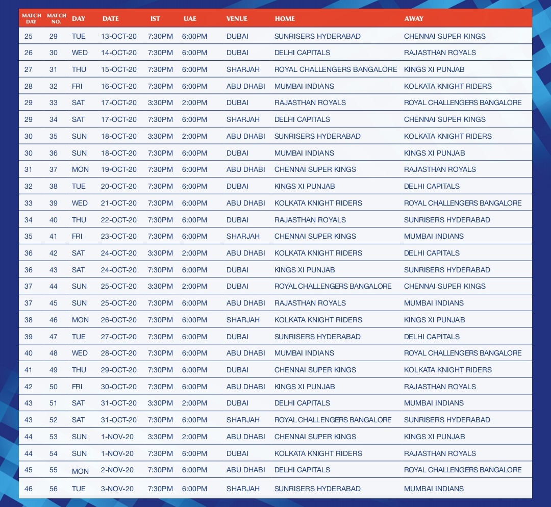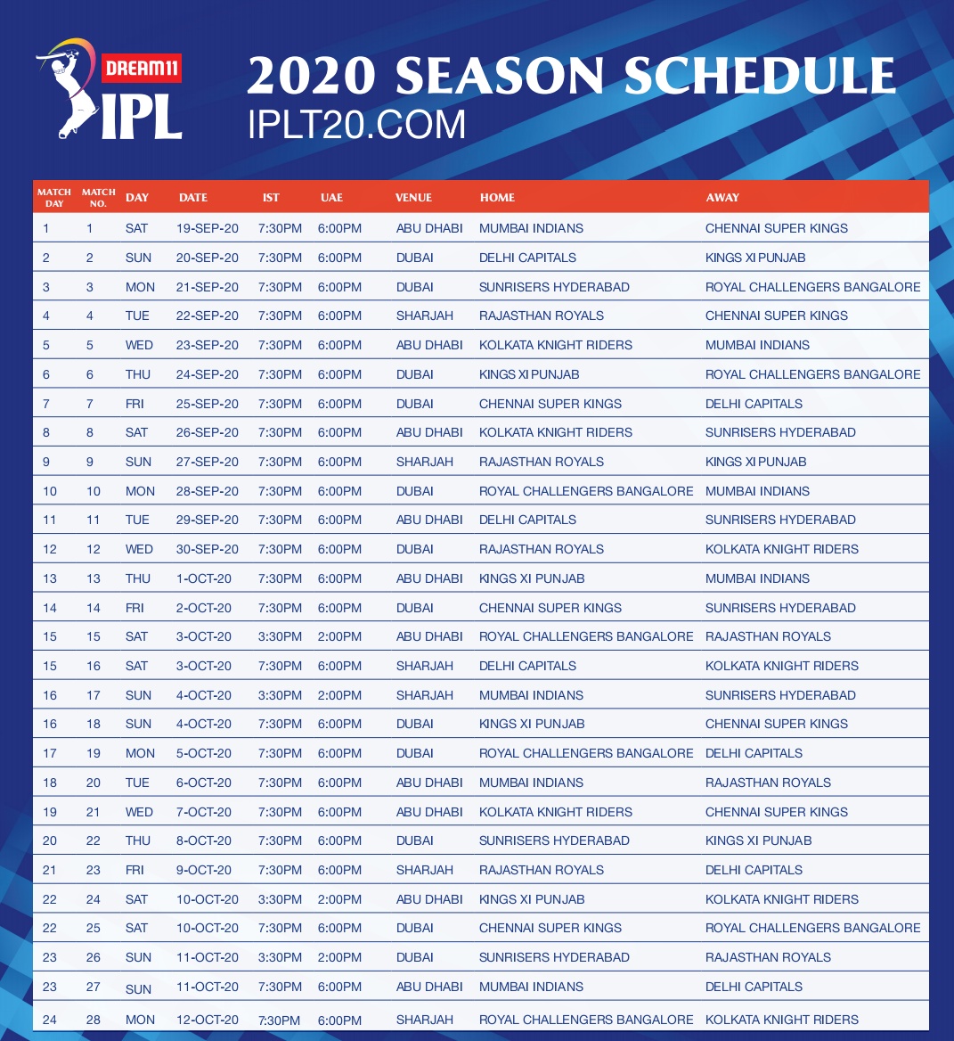 ଭାରତୀୟ କ୍ରିକେଟ୍ କଣ୍ଟ୍ରୋଲ୍ ବୋର୍ଡ (ବିସିସିଆଇ)ର ସୂଚନାନୁଯାୟୀ ଟୁର୍ଣ୍ଣାମେଣ୍ଟର ପ୍ରଥମ ବ୍ୟାଚ୍ ଚେନ୍ନାଇ ସୁପର କିଙ୍ଗସ ଓ ମୁମ୍ବାଇ ଇଣ୍ଡିଆନ୍ସ ମଧ୍ୟରେ ସେପ୍ଟେମ୍ବର ୧୯ ତାରିଖରେ ଆବୁଧାବି ଠାରେ ଖେଳାଯିବ ।