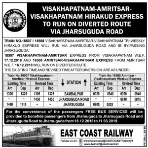 ଇଷ୍ଟକୋଷ୍ଟ ରେଳବାଇ ପକ୍ଷରୁ ମିଳିଥିବା ସୂଚନା ଅନୁଯାୟୀ ମଙ୍ଗଳବାର ଦିନ ପ୍ରଥମ ଟ୍ରେନ ଭାବେ ବିଶାଖାପଟ୍ଟନମ୍-ଅମୃତସର-ବିଶାଖାପଟ୍ଟନମ୍ ହୀରାକୁଦ ଏକ୍ସପ୍ରେସର ଗତି ପରିବର୍ତ୍ତନ କରାଯିବ । ଏହା ଝାରସୁଗୁଡା ରୋଡ ଦେଇ ଆଇବି-ବେଲପାହାଡ ଷ୍ଟେସନ ମଧ୍ୟରେ ଚାଲିବ । ଏହା ପରେ ପରବର୍ତ୍ତୀ ସୂଚନା ମିଳିବ ।