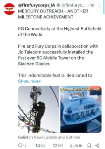 ନୂଆଦିଲ୍ଲୀ: ଜିଓ ବିଶ୍ୱର ସର୍ବୋଚ୍ଚ ଯୁଦ୍ଧ କ୍ଷେତ୍ର ସିଆଚିନ ଗ୍ଲେସିୟରରେ ୫ଜି ସେବା ଆରମ୍ଭ କରିଛି । ଭାରତୀୟ ସେନାର ‘ଫାୟାର ଆଣ୍ଡ ଫ୍ୟୁରି କର୍ପସ’ ନିଜର ଏକ୍ସ ଆକାଉଣ୍ଟରେ ପୋଷ୍ଟ ଜରିଆରେ ଏହି ସୂଚନା ଦେଇଛନ୍ତି । ଜିଓ ଟେଲିକମ୍ ଏବଂ ଭାରତୀୟ ସେନା ମିଳିତ ଭାବେ ବିଶ୍ୱର ସର୍ବୋଚ୍ଚ ଯୁଦ୍ଧ କ୍ଷେତ୍ର ସିଆଚିନ ଗ୍ଲେସିୟର ଉପରେ ପ୍ରଥମ ୫ଜି ମୋବାଇଲ୍ ଟାୱାର ସ୍ଥାପନ କରିଛନ୍ତି।