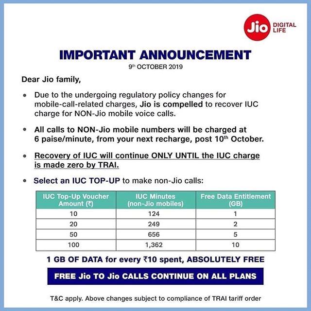 ତେବେ ୨୦୧୭ ମସିହାରେ ଟ୍ରାଇ ‘ଆଇୟୁସି’କୁ ହ୍ରାସ କରି ୧୪ ପଇସାରୁ ୬ ପଇସା କରି ଦେଇଥିଲା । ଜାନୁଆରୀ ୨୦୨୦ରେ ଏହାକୁ ହଟାଇ ଦିଆଯିବ ବୋଲି ସୂଚନା ମିଳିଛି । ଜିଓ ଅନ୍ୟ କମ୍ପାନୀମାନଙ୍କୁ ଦେଇଥିବା ପଇସାର ଭରଣା ପାଇଁ ଏପରି କରୁଥିବା କମ୍ପାନୀ ପକ୍ଷରୁ ସୂଚନା ମିଳିଛି ।
