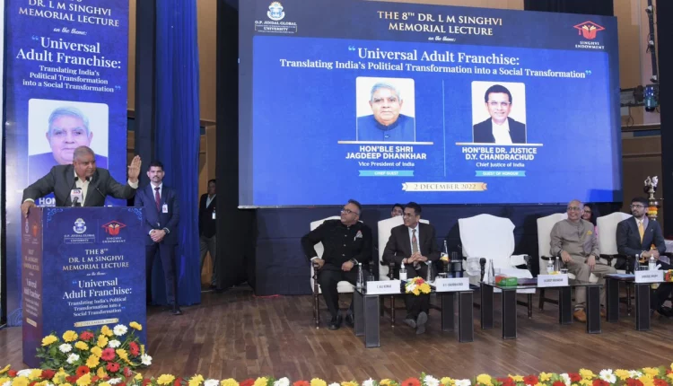 ସେ କହିଛନ୍ତି ଯେ ନ୍ୟାୟପାଳିକା କଦାପି ବିଧାନସଭା କିମ୍ବା କାର୍ଯ୍ୟନିର୍ବାହୀ ହୋଇପାରିବ ନାହିଁ କାରଣ ଶାସନର ଗୋଟିଏ ଅଙ୍ଗର ଅନ୍ୟର କାର୍ଯ୍ୟକ୍ଷେତ୍ରରେ ଅନୁପ୍ରବେଶ ଶାସନ ବ୍ୟବସ୍ଥାକୁ ବିଚଳିତ କରିପାରେ। ଦିଲ୍ଲୀର ଅଷ୍ଟମ ଡକ୍ଟର ଏଲ.ଏମ ସିଂଭି ମେମୋରିଆଲ ଲେକ୍ଚରରେ ଧନଖର ଏହା କହିଛନ୍ତି। ଏହି କାର୍ଯ୍ୟକ୍ରମରେ ଭାରତର ପ୍ରଧାନ ବିଚାରପତି ମଧ୍ୟ ଉପସ୍ଥିତ ଥିଲେ।