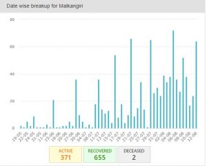 ବର୍ତ୍ତମାନ ସୁଦ୍ଧା ୬୫୫ ଜଣ ଆରୋଗ୍ୟ ଲାଭ କରିଛନ୍ତି । ଚିକିତ୍ସାଧୀନ ଅଛନ୍ତି ୩୭୧ ଆକ୍ରାନ୍ତ । ଦୁଇ ଜଣଙ୍କର ଜୀବନ ନେଇଛି କରୋନା । ମାଲକାନଗିରି ଜିଲ୍ଲାରୁ ମେ ୧୯ ତାରିଖରେ ପ୍ରଥମ ଆକ୍ରନ୍ତ ଚିହ୍ନଟ ହୋଇଥିଲେ ।