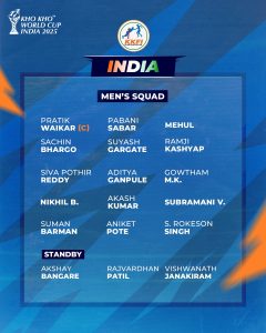ଭୁବନେଶ୍ୱର: ନୂଆଦିଲ୍ଲୀଠାରେ ଆଗାମୀ ୧୩ ତାରିଖଠାରୁ ୧୯ ତାରିଖ ପର୍ୟ୍ୟନ୍ତ ପ୍ରଥମ ଖୋଖୋ ବିଶ୍ବକପ୍ ଆୟୋଜିତ ହେବ। ଖୋଖୋ ଫେଡେରେସନ ଅଫ୍ ଇଣ୍ଡିଆ ପକ୍ଷରୁ ବିଶ୍ବକପ୍ ଲାଗି ଗୁରୁବାର ଦିନ ଉଭୟ ଭାରତୀୟ ମହିଳା ଓ ପୁରୁଷ ଦଳ ଘୋଷଣା କରାଯାଇଛି। ତେବେ ଭାରତୀୟ ଦଳରେ ଓଡିଶାରୁ ୩ ଖେଳାଳି ସ୍ଥାନ ପାଇଛନ୍ତି ।