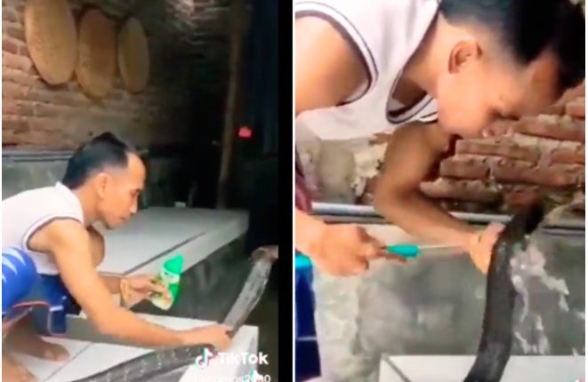 ଭାଇରାଲ ଭିଡ଼ିଓରେ ଦେଖିବାକୁ ମିଳିଛି ଯେ, ଗୋଟିଏ କିଙ୍ଗ୍ କୋବ୍ରା ଚଟାଣରେ ଲମ୍ବ ହୋଇ ଶୋଇ ରହିଛି । ଜଣେ ବ୍ୟକ୍ତି ଏହି ସାପର ଶରୀରରେ ସାମ୍ପୁ ଲଗାଇ ଘସି ଦେଉଛନ୍ତି । ପରେ ପାଇପ ସାହାଯ୍ୟରେ ପାଣି ପକାଇ ଗାଧୋଇ ଦେଉଛନ୍ତି । ଏହି ବିପଜ୍ଜନକ ସାପଟି ଶାନ୍ତ ସରଳ ଭାବେ ଦେଖାଇ ଦେଉଛି । ବ୍ୟକ୍ତି ଜଣକ ଏହି କିଙ୍ଗ୍ କୋବ୍ରାର ମୁଣ୍ଡରୁ ଲାଞ୍ଜ ପର୍ଯ୍ୟନ୍ତ ସମ୍ପୂର୍ଣ୍ଣ ସଫା କରି ଦେଉଛନ୍ତି । ଗାଧୋଇ ସାରିବା ପରେ ସାପଟି ଧୀରେ ଧୀରେ ପାହାଚ ତଳକୁ ଚାଲିଯାଉଛି ।