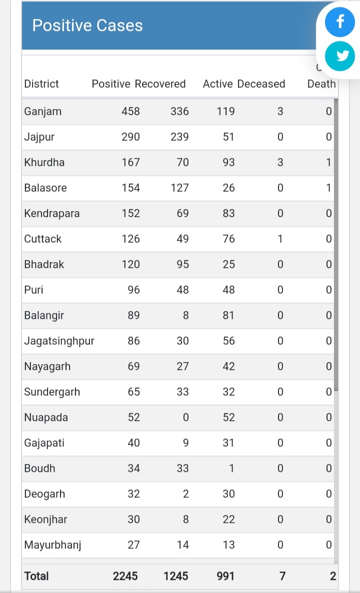 ଏହି ଆକ୍ରାନ୍ତଙ୍କୁ ମିଶାଇ ରାଜ୍ୟରେ ମୋଟ ଆକ୍ରାନ୍ତଙ୍କ ସଂଖ୍ୟା ୨୨୪୫ ରେ ପହଂଚି ଥିବା ରାଜ୍ୟ ସ୍ୱାସ୍ଥ୍ୟ ବିଭାଗ ସୂଚନା ଦେଇଛି । ଚିହ୍ନଟ ୧୪୧ ଆକ୍ରାନ୍ତଙ୍କ ମଧ୍ୟରୁ ୧୧୦ ଜଣ କ୍ୱାରେଣ୍ଟାଇନରେ ଥିବା ବେଳେ ୩୧ ଜଣ ସ୍ଥାନୀୟ ବାସିନ୍ଦା ହୋଇଥିବା ସ୍ୱାସ୍ଥ୍ୟ ବିଭାଗ ପକ୍ଷରୁ ସୂଚନା ମିଳିଛି ।