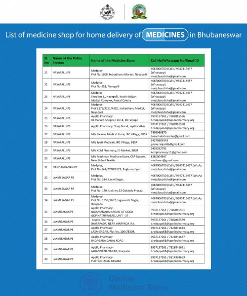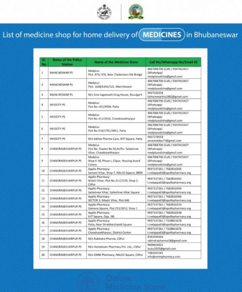 ତାଲିକାରେ ଦିଆଯାଇଥିବା ମେଡିସିନ ଷ୍ଟୋରକୁ ଆପଣ କଲ କିମ୍ବା ହ୍ୱାଟ୍ସ୍‌ଅପ୍ କଲେ ସେମାନେ ହୋମଡେଲିଭରି ଦେବେ ବୋଲି ବିଏମସି ପକ୍ଷରୁ ଟ୍ୱିଟ୍  ସୂଚନା ଦିଆଯାଇଛି ।