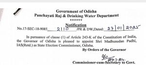 ଆଦିତ୍ୟ ପାଢ଼ୀଙ୍କ ଅବସର ପରେ ଖାଲି ପଡ଼ିଥିଲା ରାଜ୍ୟ ନିର୍ବାଚନ କମିଶନର ପଦ । ରାଜ୍ୟ ସରକାରଙ୍କ ପକ୍ଷରୁ ଆଜି ମଧୁସୂଦନ ପାଢ଼ୀଙ୍କୁ ଏହି ପଦରେ ନିଯୁକ୍ତି ପ୍ରଦାନ କରାଯାଇଛି ।
