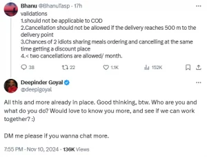 ‘ଫୁଡ୍ ରେସ୍କୁ’ ଲଞ୍ଚ କରି ଦିପିନ୍ଦର ନିଜ ଏକ୍ସ ଆକାଉଣ୍ଟରେ ଏକ ପୋଷ୍ଟ ସେୟାର କରିଥିଲେ । ବିଭିନ୍ନ ସୋସିଆଲ ମିଡିଆ ୟୁଜର୍ସ ଏଥିରେ ନିଜ ନିଜର ମତ ରଖୁଥିଲେ । ଯେଉଁଥିରେ ବେଙ୍ଗାଲୁରୁର ଭାନୁ ନାମକ ଯୁବକ ‘ଫୁଡ୍ ରେସ୍କୁ’ର ଅପବ୍ୟବହାରକୁ ରୋକିବା ପାଇଁ ଜୋମାଟୋକୁ ୪ଟି ପରାମର୍ଶ ଦେଇଥିଲେ । ଯାହାକୁ ପଢିବା ପରେ ଦିପିନ୍ଦର ସିଧା ତାଙ୍କୁ ଜୋମାଟୋ ସହ କାମ କରିବା ପାଇଁ ପ୍ରସ୍ତାବ ଦେଇଥିଲେ ।
