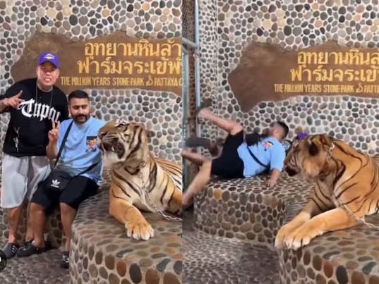 ଭାଇରାଲ ହେଉଥିବା ଭିଡିଓରେ ଦେଖିବାକୁ ମିଳିଛି ଯେ, ଥାଇଲ୍ୟାଣ୍ଡର ଏକ ଚିଡ଼ିଆଖାନାରେ ଏକ ବାଘ ବସିଛି । ଆଉ ସେ ଶିକୁଳିରେ ବନ୍ଧା ହୋଇଛି । ଏହି ସମୟରେ ଦୁଇ ଜଣ ପର୍ଯ୍ୟଟକ ବାଘ ପାଖକୁ ଯାଇ ଫଟୋ ପୋଜ ଦେଉଛନ୍ତି । ଅନ୍ୟ ଜଣେ ପର୍ଯ୍ୟଟକ ଏକ ବାଡ଼ି ସାହାଯ୍ୟରେ ମୁହଁ ଉପରକୁ କରିବାକୁ ବାଘକୁ ପିଟୁଛନ୍ତି । ବାଘଟି ରାଗି ଯାଇ ଜୋରରେ ଗର୍ଜନ କରିବାରୁ ବିଚରା ଦୁଇ ପର୍ଯ୍ୟଟକ ପଡ଼ି ଉଠି ଦୌଡ଼ିଛନ୍ତି । ଜୀବନ ବଞ୍ଚିଯାଇଥିବାରୁ ବାହାରକୁ ଆସି ମୁଣ୍ଡିଆ ମାରି ଭଗବାନଙ୍କୁ ଧନ୍ୟବାଦ ଦେଉଛନ୍ତି ।