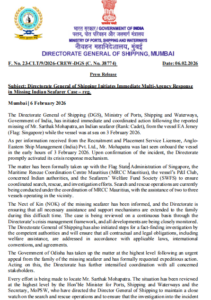 ଭୁବନେଶ୍ବର: ଓଡ଼ିଆ ନାବିକ ନିଖୋଜ ଘଟଣା ୨ ଦେଶ ସହ ଆରମ୍ଭ ହେଲା ମିଳିତ ସର୍ଚ୍ଚ ଅପେରସନ । ସିଙ୍ଗାପୁର ଓ ମରିସସ ସହ ସର୍ଚ୍ଚ ଅପରେସନ ଆରମ୍ଭ ନେଇ ସିପିଙ୍ଗ ଡିଜିଙ୍କ ସୂଚନା । ପ୍ରେସ ରିଲିଜ ଜରିଆରେ ଓଡ଼ିଶା ସରକାରଙ୍କ ଚିଠିର ଜବାବ ରଖିଲେ ଡିଜି ।