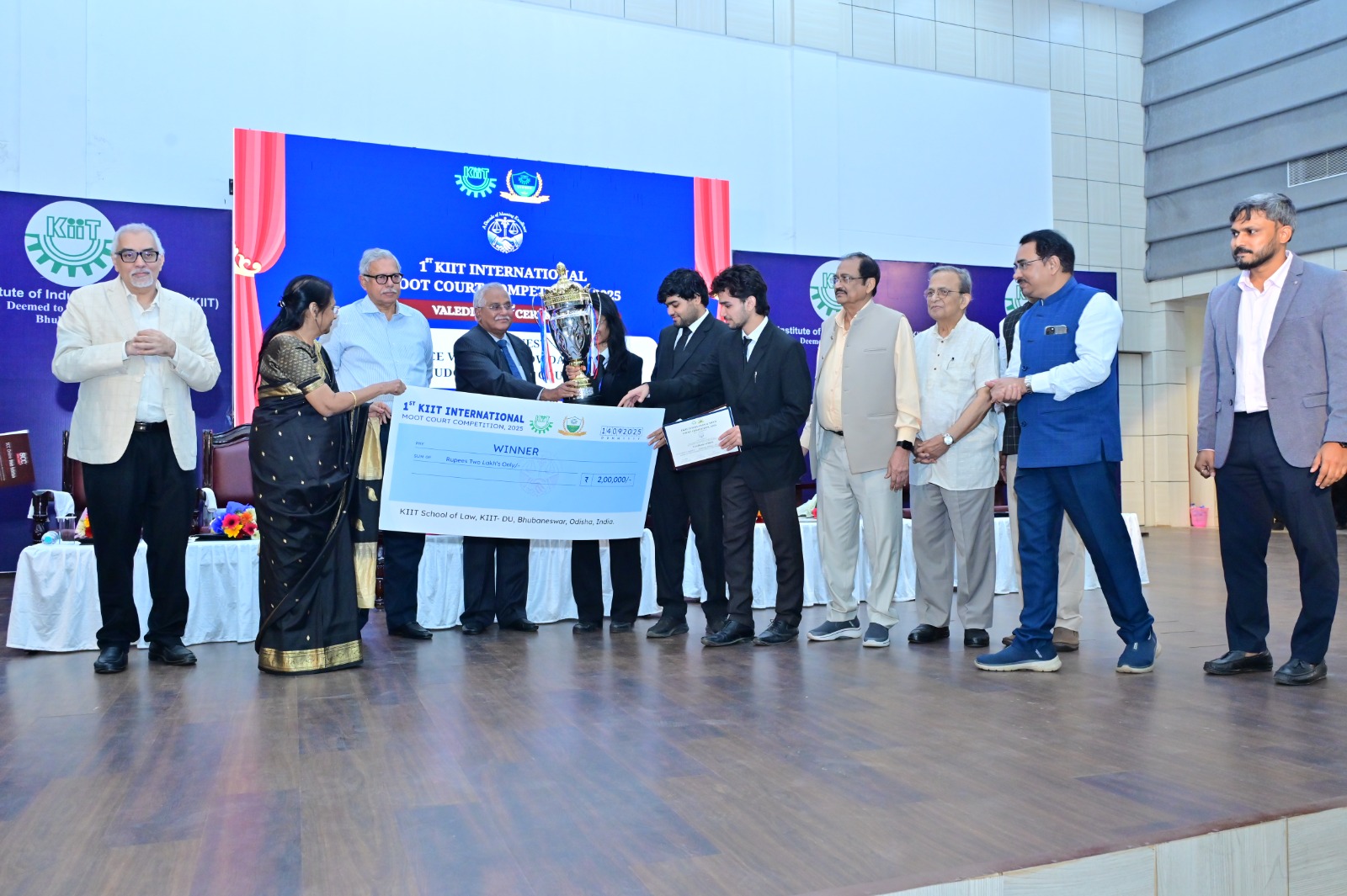 ଭୁବନେଶ୍ୱର: ପ୍ରଥମ କିଟ୍ ଇଣ୍ଟରନ୍ୟାସନାଲ ମୁଟ୍ କୋର୍ଟ ପ୍ରତିଯୋଗିତା ୨୦୨୫ ରବିବାର ଉଦଯାପିତ ହୋଇଯାଇଛି। ଏଥିରେ ନାଲସାର, ହାଇଦ୍ରାବାଦ ଦଳକୁ ବିଜୟୀ ଘୋଷଣା କରାଯିବା ସହ ୨ ଲକ୍ଷ ଟଙ୍କାର ନଗଦ ଆର୍ଥିକ ପୁରସ୍କାର ପ୍ରଦାନ କରଯାଇଥିଲା। ସେହିପରି ଶାସ୍ତ୍ରା ୟୁନିଭରସିଟି ପ୍ରଥମ ରନର୍ସ-ଅପ୍ ଭାବରେ ୧ ଲକ୍ଷ ଟଙ୍କା ଓ ମଣିପାଲ ଲ ସ୍କୁଲ ଦ୍ୱିତୀୟ ରନର୍ସ-ଅପ୍ ହୋଇ ୭୫ ହଜାର ଟଙ୍କାର ପୁରସ୍କାର ହାସଲ କରିଥିଲା।