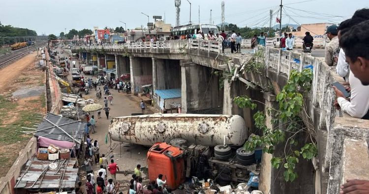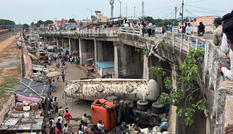 ଫ୍ଲାଏଓଭରରୁ ଖସିଲା ଟ୍ୟାଙ୍କର, ଅଳ୍ପକେ ବର୍ତ୍ତିଲେ ଲୋକେ