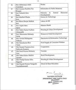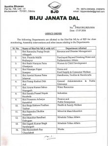 ବିଭିନ୍ନ ବିଭାଗ ଉପରେ ନିଘା ରଖିବା ପାଇଁ ଦାୟିତ୍ୱ ବାଣ୍ଟିଲେ ନବୀନ ପଟ୍ଟନାୟକ। ସରକାରଙ୍କ କାର୍ଯ୍ୟ ଉପରେ ନିଘା ରଖିବାକୁ ନିଜ ବିଧାୟକଙ୍କୁ ଦାୟିତ୍ୱ ବାଣ୍ଟିଲେ। ରାଜା ସ୍ୱାଇଁଙ୍କୁ ରାଜସ୍ୱ ବିଭାଗ, ପ୍ରମିଳାଙ୍କୁ ପଞ୍ଚାୟତିରାଜ ବିଭାଗ, ବଦ୍ରିଙ୍କୁ ମହିଳା ଓ ଶିଶୁ ବିକାଶ ବିଭାଗ, ନିରଞ୍ଜନ ପୂଜାରୀଙ୍କୁ ଗୃହ ବିଭାଗ, ପ୍ରସନ୍ନ ଆଚାର୍ଯ୍ୟଙ୍କୁ ଅର୍ଥ ବିଭାଗ, ପ୍ରତାପ ଦେବଙ୍କୁ ଜିଏ, ଅରୁଣଙ୍କୁ ଜଳ ସଂପଦ ବିଭାଗ, ବ୍ରଜ ପ୍ରଧାନଙ୍କୁ ସ୍ୱାସ୍ଥ୍ୟ ବିଭାଗ, ରାଜେନ୍ଦ୍ର ଢୋଲକିଆଙ୍କୁ ଗଣଶିକ୍ଷା ବିଭାଗରେ ଦାୟିତ୍ୱ ବାଣ୍ଟିଛନ୍ତି ନବୀନ ପଟ୍ଟନାୟକ।