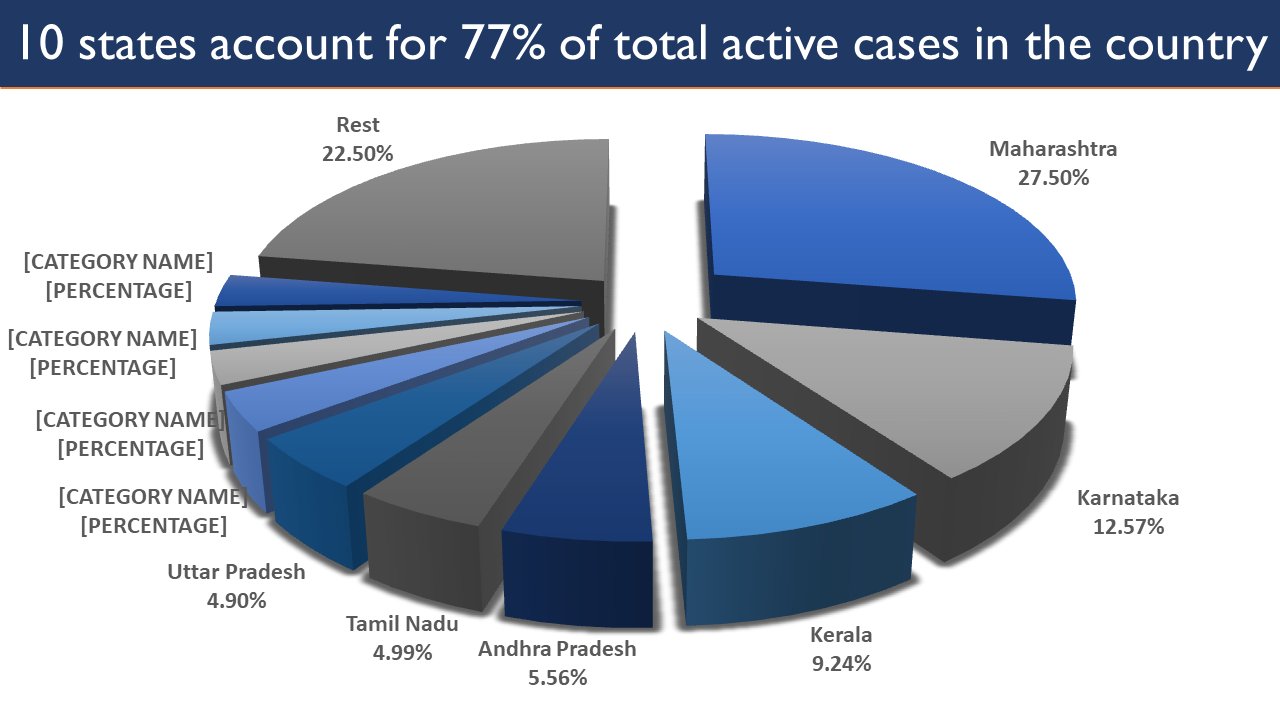 ମହାରାଷ୍ଟ୍ର, କର୍ଣ୍ଣାଟକ, କେରଳ, ଆନ୍ଧ୍ରପ୍ରଦେଶ, ତାମିଲନାଡୁ, ଉତ୍ତରପ୍ରଦେଶ ଭଳି ୧୦ଟି ରାଜ୍ୟରେ ସର୍ବାଧିକ ଆକ୍ଟିଭ୍ କେସ ରହିଛି । ଦେଶର ମୋଟ ଆକ୍ଟିଭ କେସର କେବଳ ୭୭ ପ୍ରତିଶତ ସେସବୁ ରାଜ୍ୟର ଆକ୍ରାନ୍ତ ରହିଛନ୍ତି । ସେହିପରି ଗତ ଦୁଇ ସପ୍ତାହ ଧରି ଦେଶରେ ୧୦ ଲକ୍ଷ ତଳେ ରହିଛି ଆକ୍ଟିଭ୍ କେସ୍ ।
