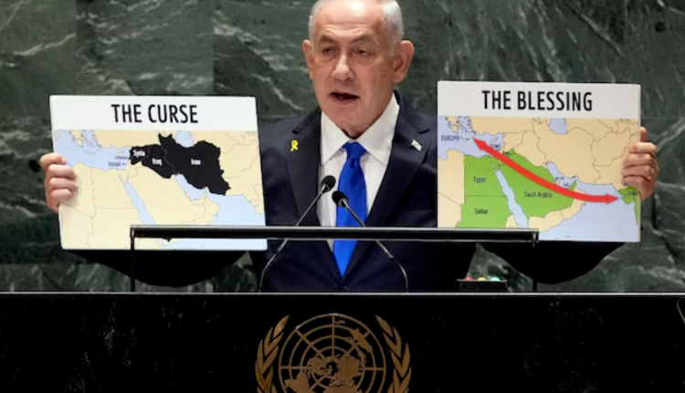 ଇସ୍ରାଏଲ୍ ପ୍ରଧାନମନ୍ତ୍ରୀଙ୍କ ଦ୍ବାରା ଉପସ୍ଥାପିତ ହୋଇଥିବା ଦୁଇଟି ମାନଚିତ୍ର ମଧ୍ୟରୁ ଗୋଟିଏରେ ଇଜିପ୍ଟ, ସାଉଦି ଆରବ, ସୁଦାନ ଏବଂ ଭାରତ ଭଳି ଦେଶ ସବୁଜ ରଙ୍ଗରେ ଚିତ୍ରିତ ହୋଇଥିବାବେଳେ ସିରିଆ, ଇରାକ, ଇରାନ ଏବଂ ୟେମେନକୁ ମାନଚିତ୍ରକୁ “ଅଭିଶାପ” ଭାବରେ ନାମିତ କରାଯାଇଛି।