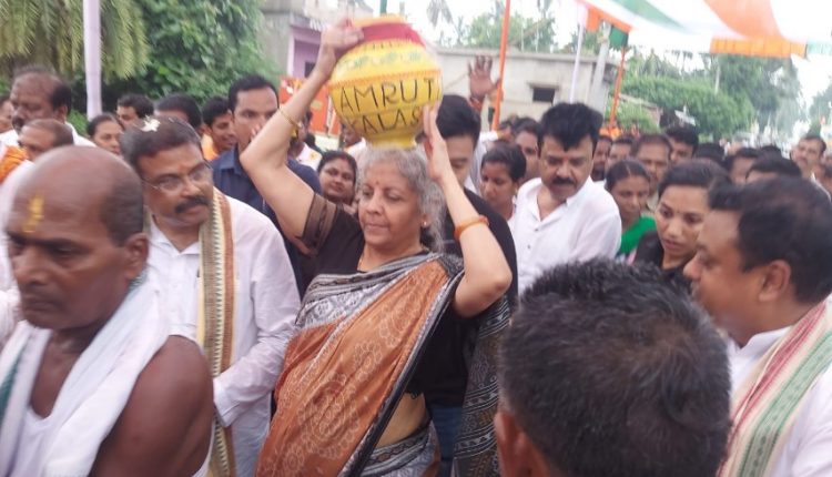 ପୁରୀ: ସ୍ୱାଧୀନତା ସଂଗ୍ରାମୀ ଜୟୀ ରାଜଗୁରୁଙ୍କ ଜନ୍ମମାଟି ପୁରୀ ବୀରହରେକୃଷ୍ଣପୁର ଗାଁରେ କେନ୍ଦ୍ର ଅର୍ଥମନ୍ତ୍ରୀ ନିର୍ମଳା ସୀତାରମଣ। ଏଠାରେ କେନ୍ଦ୍ର ମନ୍ତ୍ରୀଙ୍କୁ ସଂକୀର୍ତ୍ତନ ମଣ୍ଡଳୀ ଜରିଆରେ କରାଗଲା ସ୍ୱାଗତ। ସୀତାରମଣ ସହିଦ ଜୟୀ ରାଜଗୁରୁଙ୍କ ଜନ୍ମସ୍ଥାନ ପରିଦର୍ଶନ କରିବା ସହ ଅମୃତ କଳା ଯାତ୍ରାର ଶୁଭାରମ୍ଭ କରିଛନ୍ତି। ମୁଣ୍ଡରେ ଅମୃତ କଳସ ଧରି ସଂଗ୍ରହ କଲେ ପବିତ୍ର ମାଟି।