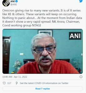 ଟେକ୍ନିକାଲ ଆର୍ଡଭାଇଜାରି ଗ୍ରୁଫ ଅନ୍ ଇମ୍ୟୁନାଇଜେସନ୍ (ଏନଟିଏଜିଆଇ) ମୁଖ୍ୟ ଏନ କେ ଆରୋରା କହିଛନ୍ତି ଓମିକ୍ରନ ଭାରିଆଣ୍ଟର ଏକ୍ସ କୌଣସି କୌଣସି ମାରାତ୍ମକ ରୋଗ ସୃଷ୍ଟି କରିବା ନାହିଁ । ଭାରତର ଡାଟାକୁ ଦେଖିଲେ ଜଣାପଡୁଛି ଯେ ସଂକ୍ରମଣ ଏତେ ମାତ୍ରାରେ ବ୍ୟାପୁନାହିଁ । ଓମିକ୍ରନ୍ ଏକ୍ସ-ଇ ପରି ଅନେକ ନୂଆ ଭାରିଆଣ୍ଟ ସୃଷ୍ଟି କରିବ ବୋଲି ସେ କହିଛନ୍ତି ।