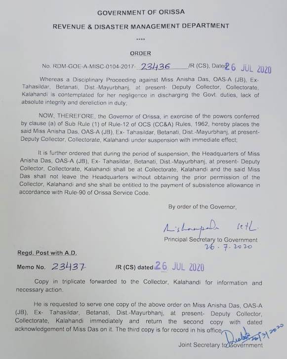 ମୟୂରଭଂଜ ଜିଲ୍ଲା ବାରିପଦାରେ ବାଲି ମାଫିଆଙ୍କ ସହ ତହସିଲଦାରଙ୍କ ଲିଙ୍କ ଥିବା ନେଇ ଅଭିଯୋଗ ହୋଇଥିଲା । ଏପରିକି ଦଲାଲଙ୍କ ଉପସ୍ଥିିତିରେ ତହସିଲଦାର ଅନିଶା ଦାସ ଲକ୍ଷେ ଟଙ୍କା ଦାବି କରୁଥିବା ଅଡିଓ ଟେପ୍ ଭାଇରାଲ ହୋଇଥିଲା । ଆଜି କାର୍ଯ୍ୟରେ ଅବହେଳା ଦର୍ଶାଇ ରାଜସ୍ୱ ଓ ବିପର୍ଯ୍ୟୟ ପ୍ରଶମନ ବିଭାଗ ପକ୍ଷରୁ ଓଏସ୍ ଅନିଶା ଦାସଙ୍କୁ ନିଲମ୍ବତ କରିବା ନେଇ ବିଜ୍ଞପ୍ତି ପ୍ରକାଶ ପାଇଛି ।