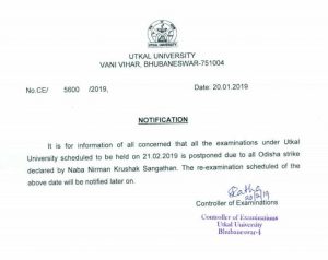 “ଏତଦ୍ୱାରା ଜଣାଇଦିଆଯାଉଛି କି, ୨୧ ଫେବୃଆରୀ ୨୦୧୯ ତାରିଖ ଦିନ ନବ ନିର୍ମାଣ କୃଷକ ସଂଗଠନ ପକ୍ଷରୁ ଓଡ଼ିଶା ବନ୍ଦ ଡ଼ାକରା ଦିଆଯାଉଥିବା ଯୋଗୁଁ ଉତ୍କଳ ବିଶ୍ୱବିଦ୍ୟାଳୟରେ ଏହି ଦିନ ସମସ୍ତ ପରୀକ୍ଷାକୁ ବାତିଲ୍ କରାଗଲା,” ବୋଲି ଏକ ବିଜ୍ଞପ୍ତି ମାଧ୍ୟମରେ ବିଶ୍ୱବିଦ୍ୟାଳୟ କର୍ତ୍ତୃପକ୍ଷ ଜଣାଇଛନ୍ତି ।