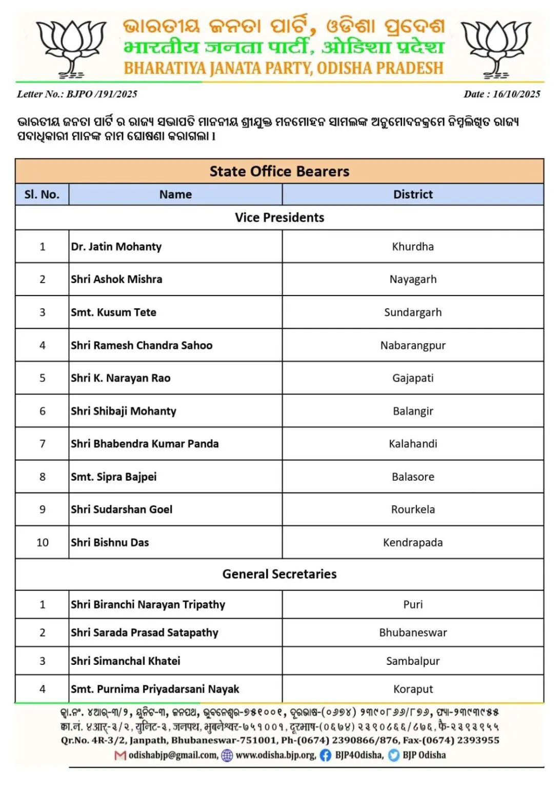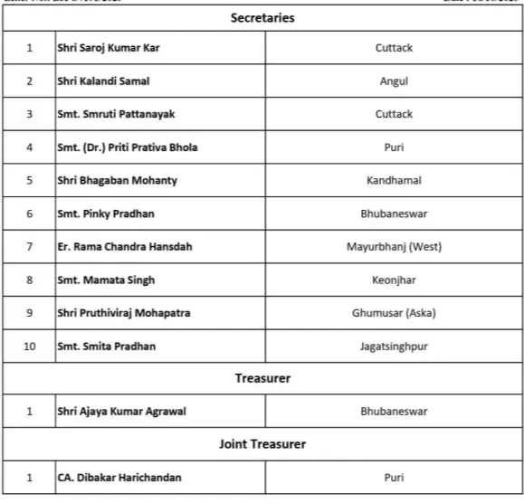 ବିଜେପି ରାଜ୍ୟ ପଦାଧିକାରୀଙ୍କ ନାଁ ଘୋଷଣା