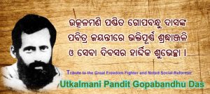 ଭୁବନେଶ୍ୱର : ଉତ୍କଳମଣି ଗୋପବନ୍ଧୁ ଦାସଙ୍କ ଆଜି ହେଉଛି ଜନ୍ମଦିନ । ସେ ୧୮୭୭ ମସିହା ଅକ୍ଟୋବର ୯ ତାରିଖରେ ପୁରୀ ଜିଲ୍ଲାର ସାକ୍ଷୀଗୋପାଳ ଅନ୍ତର୍ଗତ ସୁଆଣ୍ଡୋ ଗ୍ରାମରେ ଜନ୍ମଗ୍ରହଣ କରିଥିଲେ ।