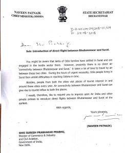 ଭୁବନେଶ୍ୱର : ଓଡିଶା ମୁଖ୍ୟମନ୍ତ୍ରୀ ନବୀନ ପଟ୍ଟନାୟକ ଆଜି କେନ୍ଦ୍ର ବେସାମରିକ ବିମାନ ଚଳାଚଳ ମନ୍ତ୍ରୀ ସୁରେଶ ପ୍ରଭୁଙ୍କ ପାଖକୁ ଏକ ଚିଠି ଲେଖିଛନ୍ତି । ସେଥିରେ ଓଡିଶାରୁ ସୁରଟକୁ ଘରୋଇ ବିମାନ ଚଳାଚଳ କରାଯିବା ନେଇ ଉଲ୍ଲେଖ କରିଛନ୍ତି ।