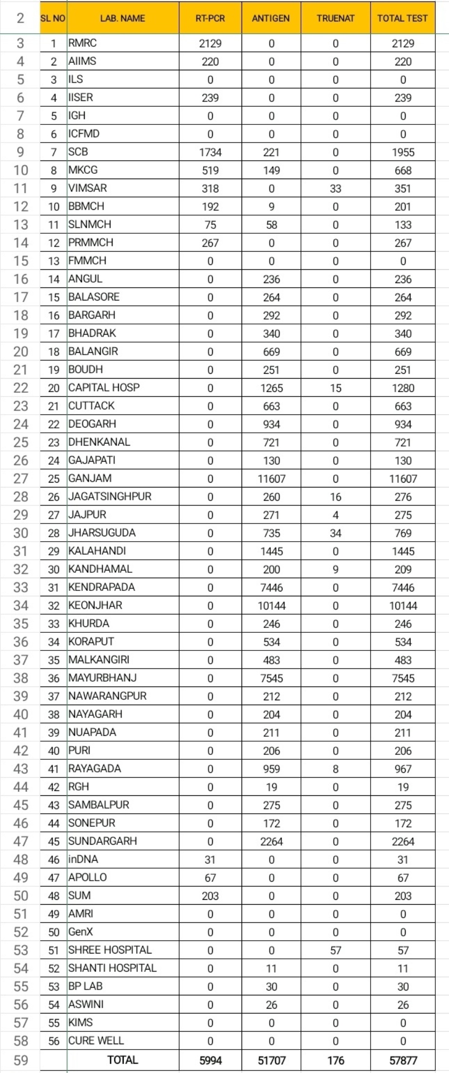 ଗୋଟିଏ ଦିନରେ ରାଜ୍ୟରେ ୫୭ ହଜାରରୁ ଅଧିକ କରୋନା ନମୁନା ପରୀକ୍ଷା