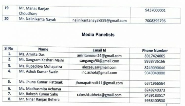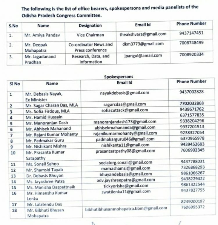 ଭୁବନେଶ୍ୱର: ଏଆଇସିସି ବୁଧବାର ଦିନ ଓଡ଼ିଶା ପ୍ରଦେଶ କଂଗ୍ରେସ କମିଟି (ଓପିସିସି)ର ପଦାଧିକାରୀ, ମୁଖପାତ୍ର ଏବଂ ମିଡିଆ ପ୍ୟାନେଲିଷ୍ଟଙ୍କ ତାଲିକା ଘୋଷଣା କରିଛି।