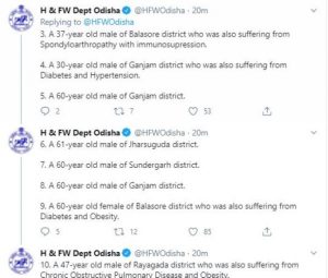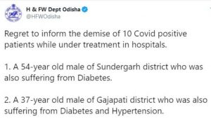 ୧୦ ଜଣଙ୍କ ଭିତରେ ଜଣେ ମହିଳା ଓ ୯ ଜଣ ପୁରୁଷ ଅଛନ୍ତି । ରାଜ୍ୟରେ କରୋନା ମୃତ୍ୟୁ ସଂଖ୍ୟା ୧୩୦କୁ ବୃଦ୍ଧି ପାଇଛି ।