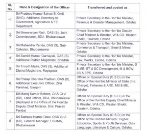 ଆଇନ ଓ ପୂର୍ତ୍ତ ମନ୍ତ୍ରୀ ପୃଥ୍ବୀରାଜ ହରିଚନ୍ଦନଙ୍କ ବ୍ୟକ୍ତିଗତ ସଚିବ ଭାବେ ଓଏଏସ୍‌ ଅଫିସର ସମ୍ବିତ କୁମାର ଗଡ଼ନାୟକଙ୍କୁ ନିଯୁକ୍ତି ମିଳିଛି। ସେହିପରି ମତ୍ସ୍ୟ ଓ ପଶୁସମ୍ପଦ, ଏମ୍‌ଏସ୍‌ଏମ୍‌ଇ ବିଭାଗ ମନ୍ତ୍ରୀ ଗୋକୁଳାନନ୍ଦ ମଲ୍ଲିକଙ୍କ ଓଏସ୍‌ଡି ଭାବେ ପ୍ରତାପ ଚନ୍ଦ୍ର ପ୍ରଧାନଙ୍କୁ ନିଯୁକ୍ତି ଦିଆଯାଇଛି। ଉଚ୍ଚଶିକ୍ଷା, କ୍ରୀଡ଼ା ବିଭାଗ ମନ୍ତ୍ରୀ ସୂର୍ଯ୍ୟବଂଶୀ ସୁରଜଙ୍କ ଓଏସ୍‌ଡି ଭାବେ ସମ୍ପଦ କୁମାର ଦଳାଇଙ୍କୁ ନିଯୁକ୍ତି ଦିଆଯାଇଛି।