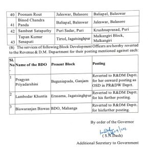 ସୁମନ ସୁଧା କୁଣ୍ଡୁ ଗଜପତି ଜିଲ୍ଲା ଗୁମ୍ମା ବ୍ଲକରେ ବିଡିଓ ଭାବେ ନିଯୁକ୍ତି ପାଇଛନ୍ତି । ସାଗର ଚନ୍ଦ୍ର ମୁର୍ମୁ ମୟୂରଭଞ୍ଜର ବିଷୋଇ ବ୍ଲକର ବିଡିଓ ହୋଇଛନ୍ତି । ପ୍ରିୟ ରଞ୍ଜନ କୁମାରଙ୍କୁ ବଲାଙ୍ଗୀରର ଦେଓଗାଁଓକୁ ବଦଳି କରାଯାଇଛି । ସନ୍ତୋଷ କୁମାର ଜେନାଙ୍କୁ ମାହାଙ୍ଗା, ଢନୀ ଚରଣ ଟୁଡୁଙ୍କୁ ମୟୂରଭଞ୍ଜ କୁସୁମିକୁ ବଦଳି କରାଯାଇଛି ।