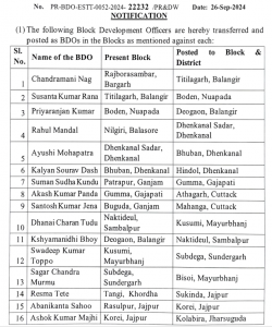 ଚନ୍ଦ୍ରମଣି ନାଗଙ୍କୁ ରାଜବଡ଼ାସମ୍ବରରୁ ଟିଟିଲାଗଡ଼କୁ ବଦଳି କରାଯାଇଥିବାବେଳେ, ସୁଶାନ୍ତ କୁମାର ରାଣାଙ୍କୁ ନୂଆପଡାବୋଡେନ ବ୍ଲକର ବିଡିଓ ଭାବେ ନିଯୁକ୍ତ କରାଯାଇଛି । ଆକାଶ କୁମାର ପଣ୍ଡା ଆଠଗଡ଼ ବିଡିଓ ହୋଇଛନ୍ତି । ରାହୁଲ ମଣ୍ଡଳଙ୍କୁ ଢେଙ୍କାନାଳ ସଦରର ବିଡିଓ କରାଯାଇଛି । ଆୟୁଷୀ ମହାପାତ୍ର ଢେଙ୍କାନାଳ ଭୁବନର ବିଡିଓ ହୋଇଛନ୍ତି । କଲ୍ୟାଣ ସୌରଭ ଦାଶ ହିନ୍ଦୋଳର ବିଡିଓ ହୋଇଥିବାବେଳେ ଅବନ୍ତିକା ସାହୁ ଯାଜପୁର କୋରେଇର ବିଡିଓ ହୋଇଛନ୍ତି ।