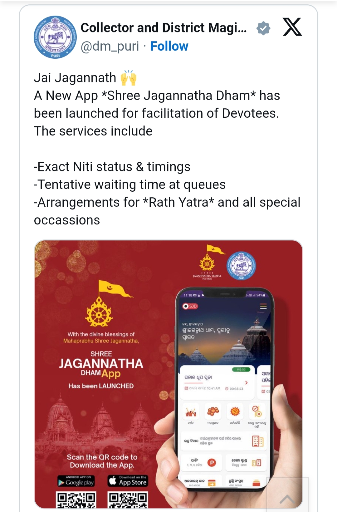 ଏହି ଆପ୍ ଶ୍ରୀ ଜଗନ୍ନାଥ ମନ୍ଦିରର ରୀତିନୀତି, ସମୟସାରଣୀ ଏବଂ ରଥଯାତ୍ରା ଭଳି ବିଶେଷ କାର୍ଯ୍ୟକ୍ରମ ବିଷୟରେ ବ୍ୟାପକ ଅପଡେଟ୍ ପ୍ରଦାନ କରିବ। ଯାହା ତୀର୍ଥଯାତ୍ରୀଙ୍କୁ ଏକପ୍ରକାର ସୁବିଧା ମିଳିବ।