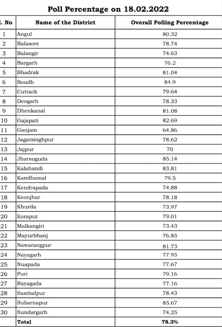 ଏଥିରୁ ଝାରସୁଗୁଡ଼ା, ୮୫.୧୪ ପ୍ରତିଶତ, ବୌଦ୍ଧରେ ୮୩.୯ ପ୍ରତିଶତ, କଳାହାଣ୍ଡିରେ ୮୩.୮୧ ପ୍ରତିଶତ ଓ ଗଜପତିରେ ୮୨.୬୯ ପ୍ରତିଶତ ଭୋଟିଂ ହୋଇଛି । ଗଞ୍ଜାମ ଜିଲ୍ଲାରେ ସର୍ବନିମ୍ନ ୬୪.୮୬ ପ୍ରତିଶତ ମତଦାନ ହୋଇଛି ।
