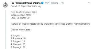 କ୍ୱାରେଣ୍ଟାଇନରୁ ୧୦୦୨ ଚିହ୍ନଟ ହୋଇଥିବା ବେଳେ ଲୋକାଲ କଣ୍ଟାକ୍ଟ କେସ୍ ରହିଛି ୫୦୧ । ଗଞ୍ଜାମ ଜିଲ୍ଲାରୁ ସର୍ବାଧିକ ୪୯୧ ନୂଆ ଆକ୍ରାନ୍ତ ଚିହ୍ନଟ ହୋଇଥିବା ବେଳେ ଖୋର୍ଦ୍ଧାରୁ ୨୨୩, କଟକ ୧୩୬, ଗଜପତି ୭୩, କନ୍ଧମାଳ ୭୩, ରାୟଗଡ଼ା ୬୮, ସୁନ୍ଦରଗଡ଼ ୫୭ ଓ ଯାଜପୁରରୁ ବାହାରିଛି ୫୧ ନୂଆ ପଜିଟିଭ୍ କେସ୍ ।