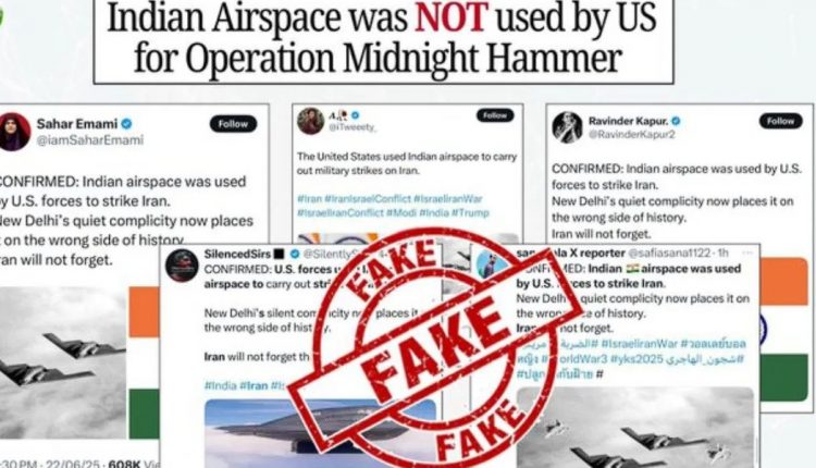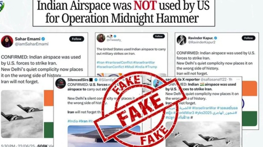 ପିଆଇବି ଫ୍ୟାକ୍ଟ ଚେକ୍ X ରେ ଏକ ପୋଷ୍ଟରେ କହିଛି ଯେ ଅନେକ ସୋସିଆଲ ମିଡିଆ ଆକାଉଣ୍ଟ ଦାବି କରିଛି ଯେ ଆମେରିକା ଅପରେସନ ମିଡନାଇଟ୍ ହାମର୍ ସମୟରେ ଇରାନ ବିରୁଦ୍ଧରେ ଆକ୍ରମଣ କରିବା ପାଇଁ ଭାରତୀୟ ବାୟୁସୀମା ବ୍ୟବହାର କରିଥିଲା। ଏହି ଦାବିଟି ମିଥ୍ୟା। ସୂଚନା ଏବଂ ପ୍ରସାରଣ ମନ୍ତ୍ରଣାଳୟ ଅଧୀନରେ କାର୍ଯ୍ୟ କରୁଥିବା ପ୍ରେସ୍ ଇନଫର୍ମେଶନ୍ ବ୍ୟୁରୋ (PIB)ର ତଥ୍ୟ ଅନୁସନ୍ଧାନକାରୀ ୟୁନିଟ୍ କହିଛି ଯେ ଅପରେସନ୍ ମିଡନାଇଟ୍ ହାମର୍ ସମୟରେ ଆମେରିକା ଦ୍ୱାରା ଭାରତୀୟ ବାୟୁକ୍ଷେତ୍ର ବ୍ୟବହାର କରାଯାଇ ନଥିଲା।